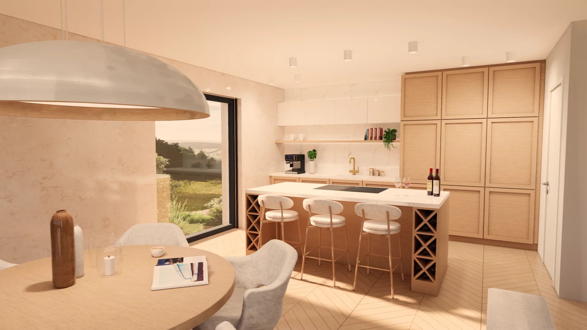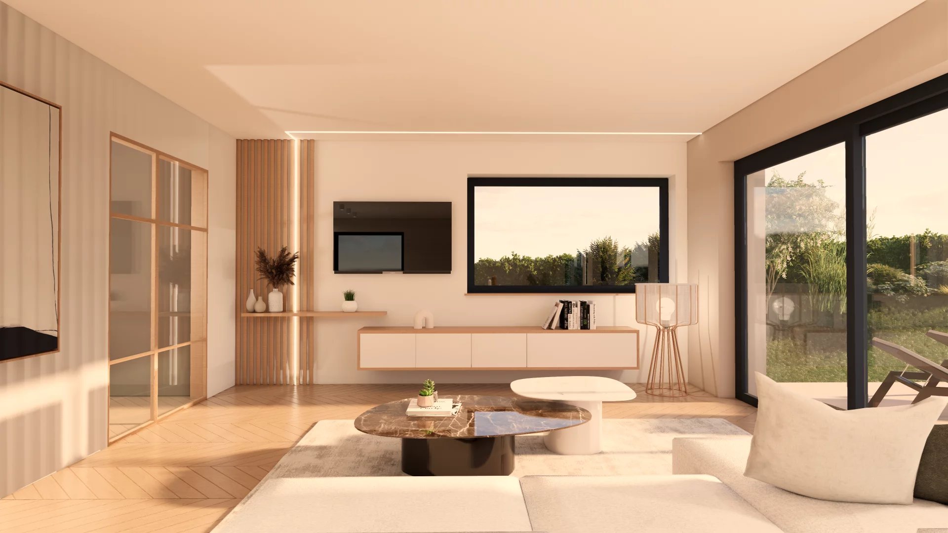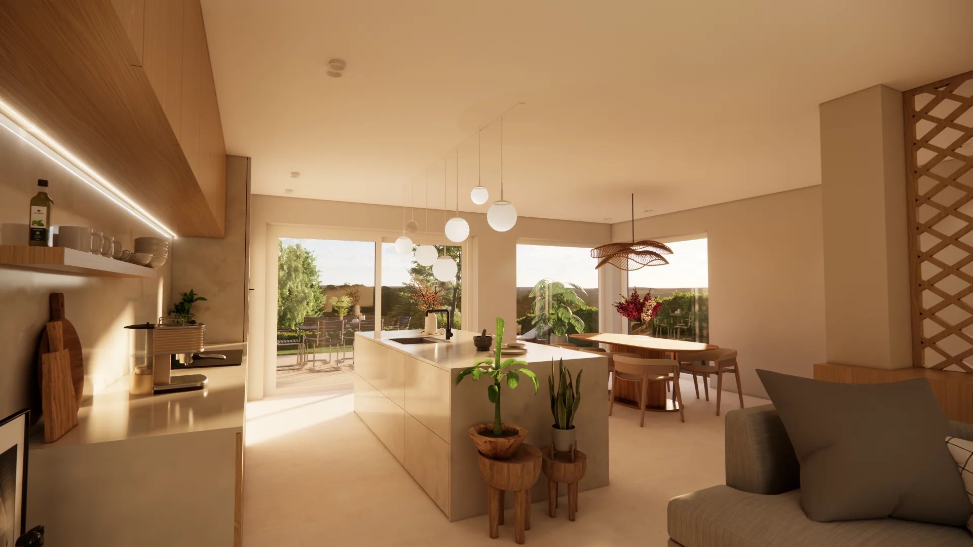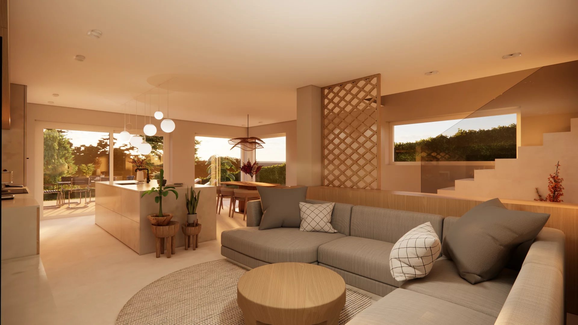 • Rez-de-jardin : Spacieux séjour avec cuisine ouverte donnant accès à la terrasse et au jardin, WC séparé, Local technique/cave, buanderie.